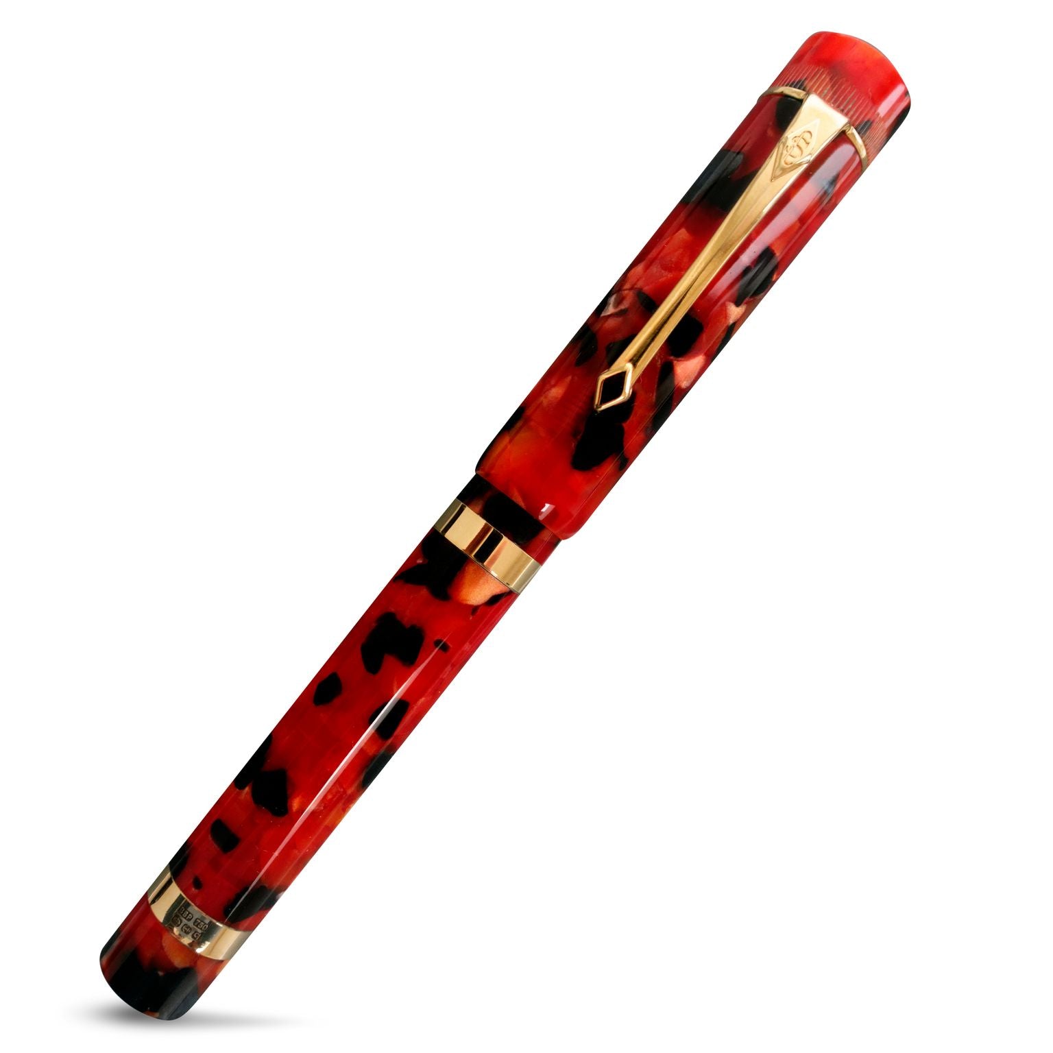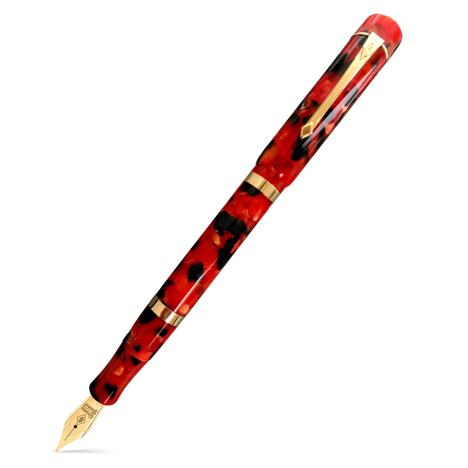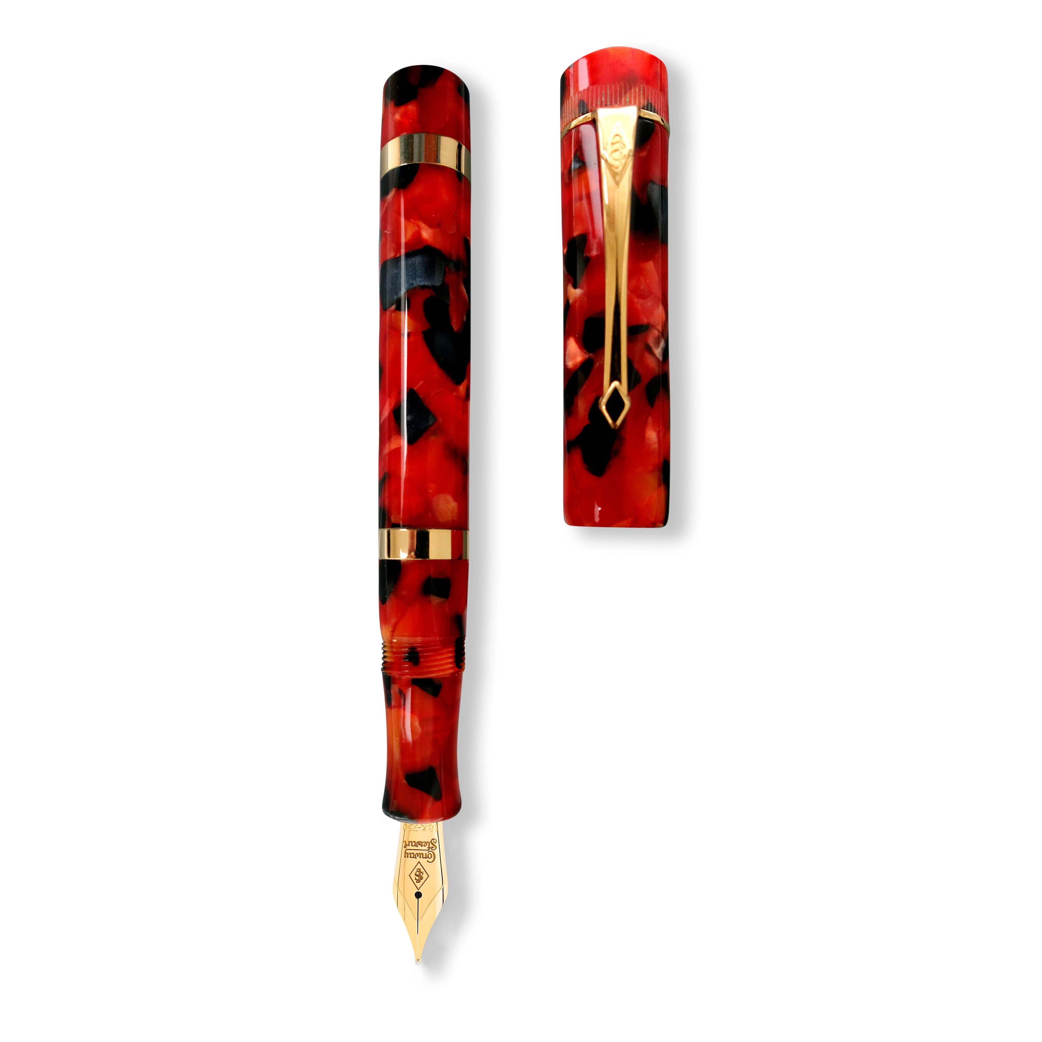 The Conway Stewart Marlborough Meteor is an elegant vintage-inspired pen that boasts a fiery Meteor acrylic body, catching the eye of any pen enthusiast. With a straight design and a vintage-style clip, this pen exudes the sophistication of the Art Deco era. The solid 9ct gold bands around the barrel, along with the serrated pattern on the top of the cap, add a touch of luxury. The Marlborough Meteor is fitted with an 18ct gold nib, making every stroke smooth and effortless. Presented in a black leather presentation box that doubles as a showcase pen stand, this pen is a stunning addition to any collection.