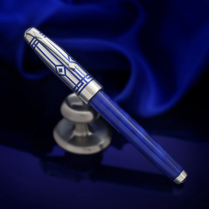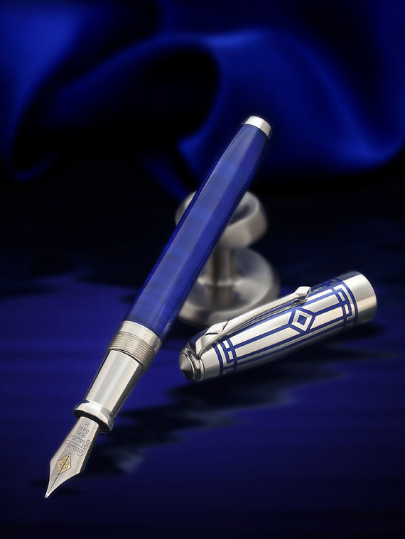 The fluid engraving pattern is offset by the crisp pattern of lines and diamonds in dark blue enamel set into the gleaming sterling silver cap.