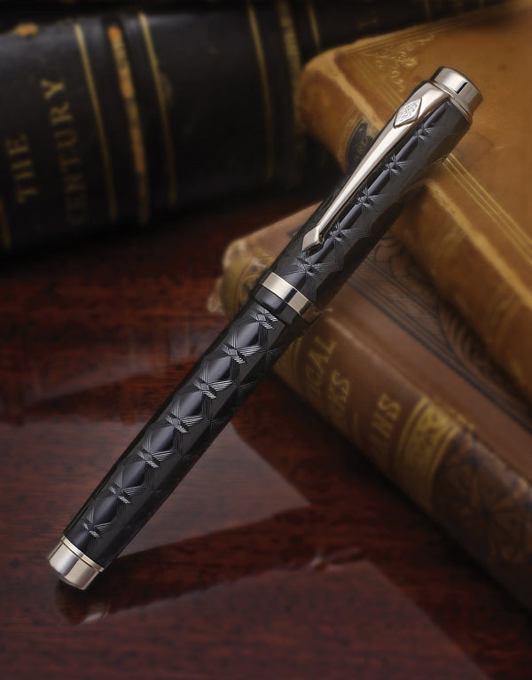 In Verbindung mit der erfolgreichen Heritage Collection ist Conway Stewart stolz, die Dandy Heritage auf den Markt zu bringen. Das Dandy-Modell verkörpert die zurückhaltende Eleganz des Stiftdesigns der 1920er Jahre und hat sich als eines der markantesten Profile von Conway Stewart erwiesen. Im Einklang mit dem klassischen Design dieses beliebten Modells verfügt die Dandy Heritage über eine glänzend schwarze Kappe und einen Schaft, jeweils mit einer aufwendigen Gravur eines Art-Déco-Designs. Ein Muster aus ineinandergreifenden geometrischen Rauten verläuft entlang des Stifts und macht den Dandy Heritage nicht nur zu einer eleganten, sondern auch stilvollen Wahl. Es passt perfekt zum heutigen geschäftigen Lebensstil und kombiniert einen zeitlosen Look mit einer praktischen Größe.