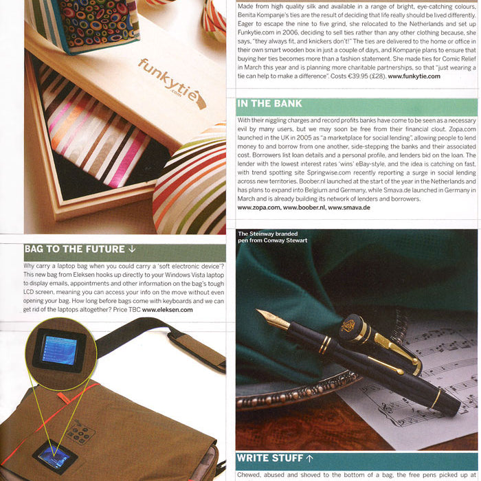 Die Krawatten von Benita Kompanje bestehen aus hochwertiger Seide und sind in einer Reihe leuchtender, auffälliger Farben erhältlich. Sie sind das Ergebnis der Entscheidung, dass das Leben wirklich anders gelebt werden sollte. Um dem Trubel von neun bis fünf zu entfliehen, zog sie in die Niederlande und gründete 2006 Funkytie.com. Sie beschloss, Krawatten statt anderer Kleidung zu verkaufen, weil, wie sie sagt, „sie immer passen, Unterhosen jedoch nicht!“ Die Krawatten werden innerhalb weniger Tage in einer eigenen schicken Holzkiste nach Hause oder ins Büro geliefert, und Kompanje möchte dafür sorgen, dass der Kauf ihrer Krawatten mehr als nur ein modisches Statement wird. Sie hat im März dieses Jahres Krawatten für Comic Relief hergestellt und plant weitere wohltätige Partnerschaften, sodass „allein das Tragen einer Krawatte dazu beitragen kann, einen Unterschied zu machen“. Kosten: 39,95 € (28 £). www.funkytie.com