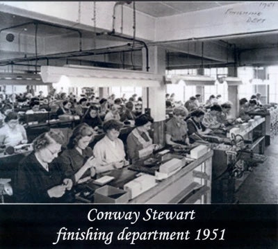 In 1905, Frank Jarvis, 22, and Howard Garner, 28, formed Conway Stewart & Co. at 13 Paternoster Row, next to St Paul’s Cathedral in London. Today, this area is known as Paternoster Square having been redeveloped after its complete destruction during the Blitz of World War II. Although there is much debate regarding the origins of the Company’s name, it is believed that the name “Conway Stewart” derives from a popular vaudeville act of the day. The two entrepreneurs originally sold pens imported from the United States, but soon grew to become one of the largest pen manufacturers. Pre-WWII Conway Stewart probably made and sold more pens in Great Britain than the combined sales of their main competitors, Mabie Todd, De La Rue, Parker and Waterman.