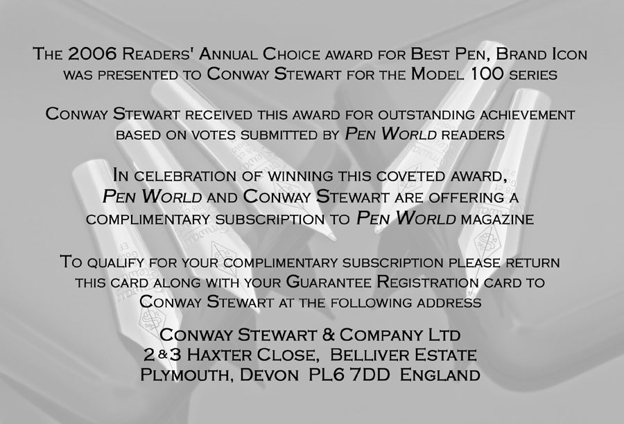 THE 2006 READERS' ANNUAL CHOICE AWARD FOR BEST PEN, BRAND ICON WAS PRESENTED TO CONWAY STEWART FOR THE MODEL 100 SERIES
