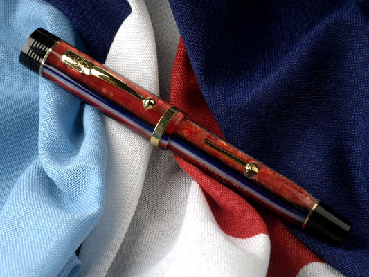 The Red Arrows Churchill fountain pen is crafted out of a high quality resin with a distinctive Red, White and Blue striation. The cap decal features the laser engraved crest of the Red Arrows squadron.