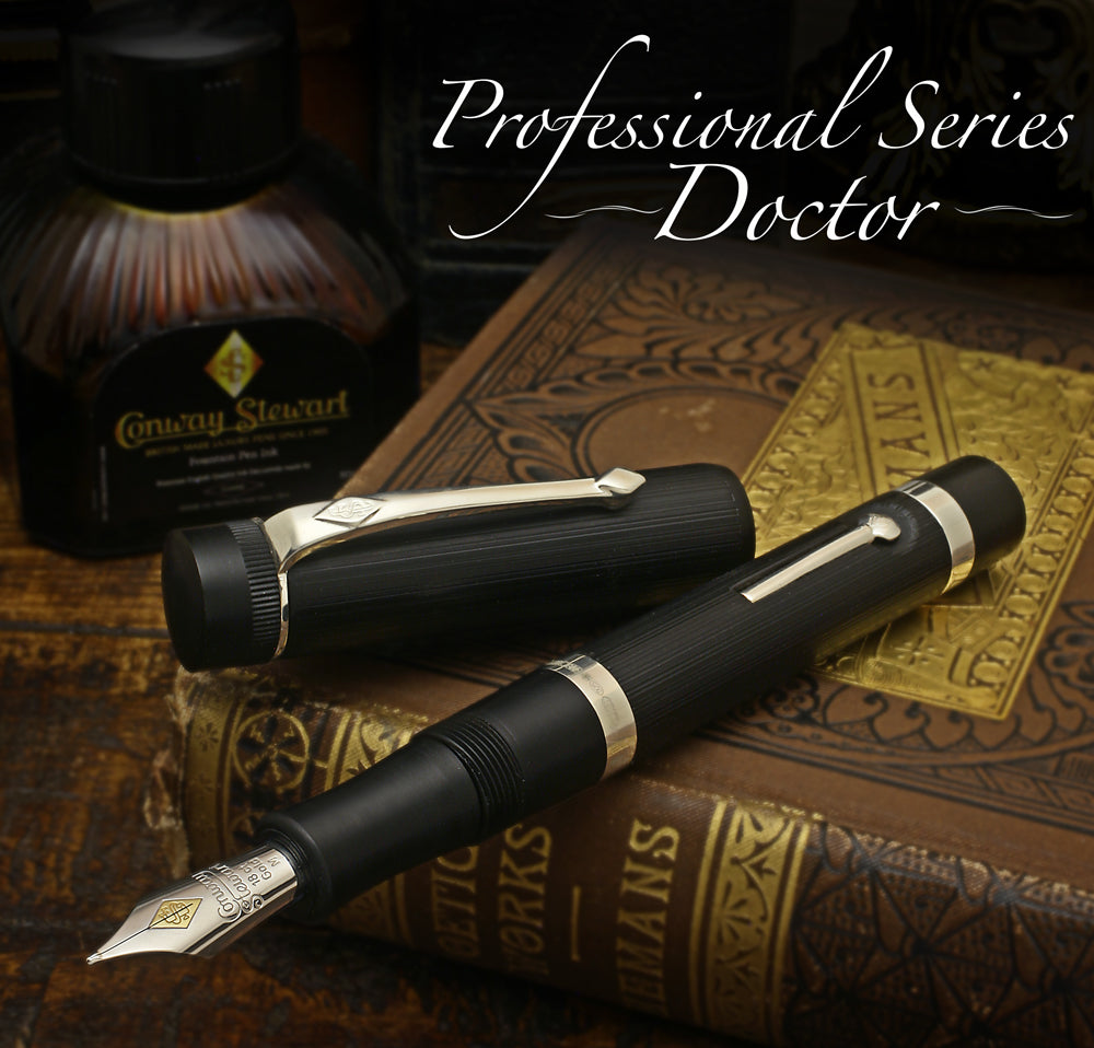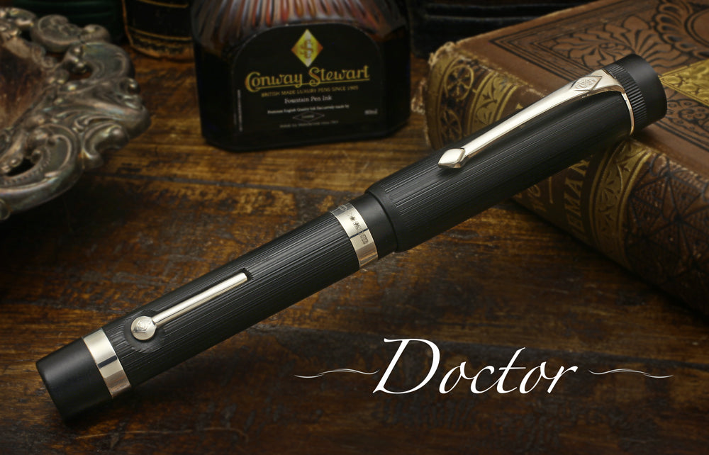 Perfectamente equilibrada en la mano, la edición Doctor cuenta con plumines macizos de oro de 18 quilates con baño de rodio a juego con el ribete de plata esterlina contrastado, y se ofrece con la opción del tradicional llenado de palanca y el confiable sistema de llenado con convertidor de cartucho.
