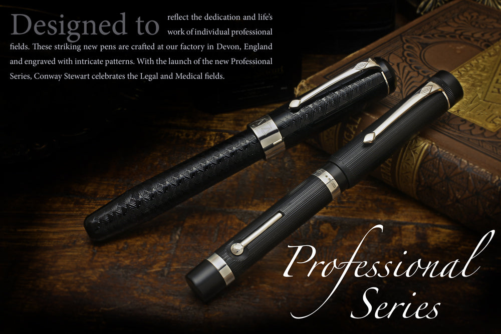 La nueva Serie Profesional Conway Stewart está diseñada para reflejar la dedicación y el trabajo de la vida de campos profesionales individuales. Estos nuevos y llamativos diseños están elaborados con resina negra brillante y ebonita mate, grabados con patrones intrincados. La Serie Profesional está perfectamente equilibrada en la mano y cuenta con puntas de oro macizo de 18 quilates con baño de rodio a juego con el adorno de plata de ley contrastado.