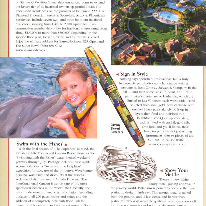 Nada dice "profesional pulido" como un bolígrafo de verdadera alta calidad. Los instrumentos de escritura hechos a mano individualmente de Conway Stewart & Company se ajustan a los requisitos, y algo más. Un ejemplo: Centenary o Harlequin del fabricante británico de bolígrafos, que están limitados a sólo 50 ejemplares cada uno en todo el mundo. Esculpidos a mano en oro macizo, ambos cautivan con incrustaciones de esmalte minuciosamente construidas en capas, luego cocidas y pulidas hasta obtener un hermoso brillo. Muy apropiadamente, cada uno está equipado con un plumín de oro de 18 quilates. Una mirada y lo sabrás: estas plumas estilográficas no son solo instrumentos de escritura, son obras de arte. $21,000. (425) 432-0816. www.conwaystewart.com.