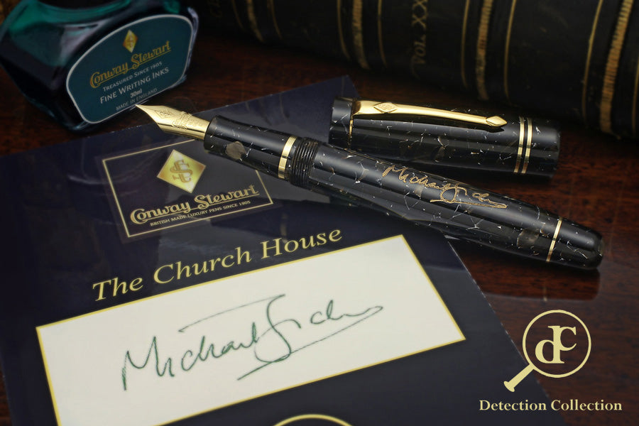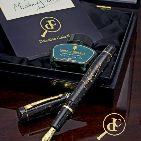 La serie de edición limitada Detección Collection se presenta en el lujoso empaque de Conway Stewart acompañada de un libro firmado personalmente y publicado exclusivamente para esta serie junto con una botella de tinta Conway Stewart elegida por el autor.