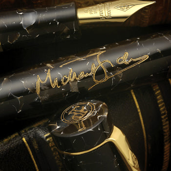 El cañón está realzado con un anillo de oro macizo de 18 quilates en la parte inferior y una gran banda de oro en la sección y el autógrafo de Michael Jeck grabado en el cañón. La gorra presenta un par de bandas de oro macizo y el logotipo de Discovery Collection grabado en la parte superior de la gorra. La pluma estilográfica está montada con un plumín de oro macizo de 18 quilates en una selección de ocho grados de plumín, desde extra fino hasta extra ancho, cursiva fina, cursiva media y cursiva ancha. La tinta se entrega a través del mecanismo de llenado por giro que permite el uso de nuestra amplia variedad de colores disponibles con tintas embotelladas.