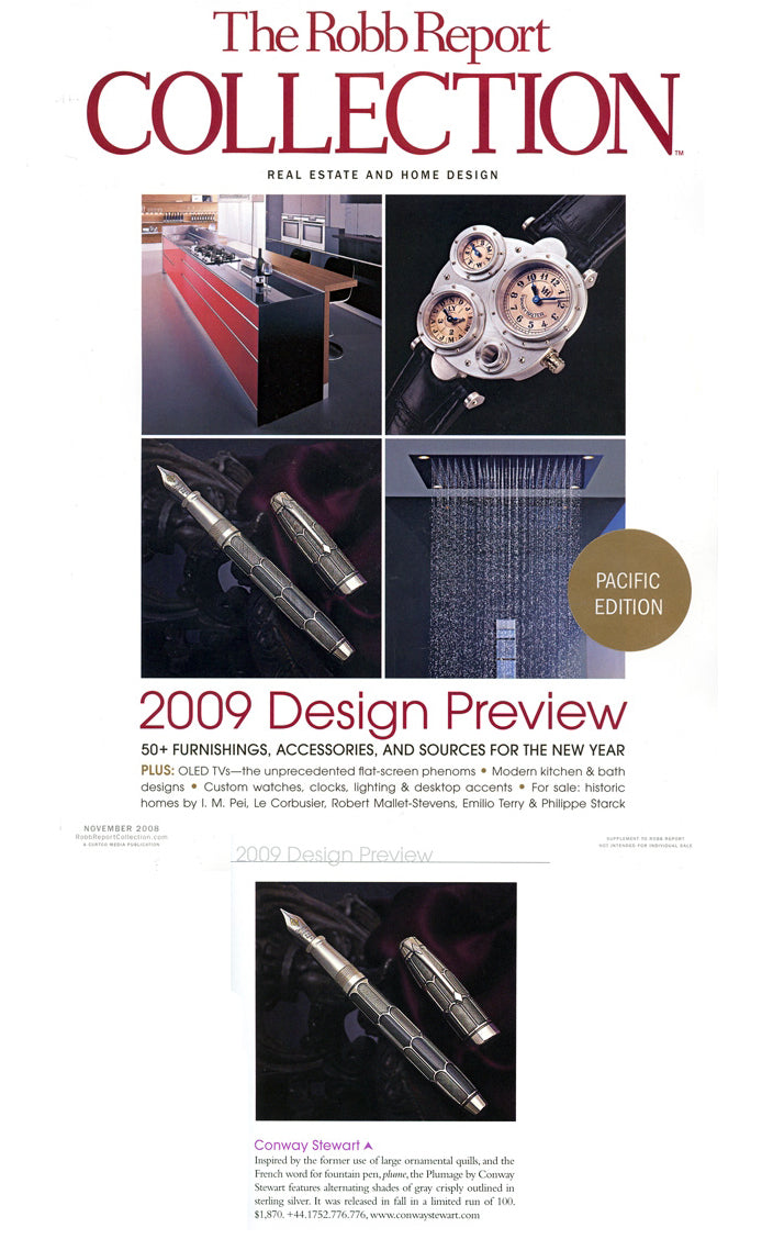 Inspirándose en el uso anterior de grandes plumas ornamentales y en la palabra francesa para pluma estilográfica, penacho, El Plumaje de Conway Stewart presenta tonos alternos de gris claramente delineados en plata de ley. Fue lanzado en una edición limitada de 100 unidades. $1,870.