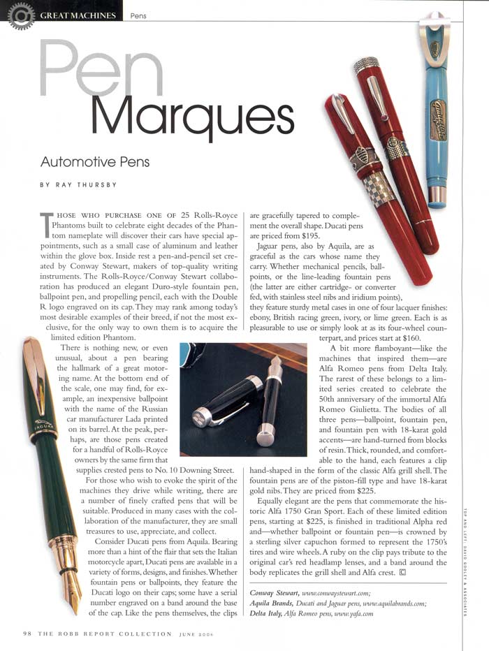 Para aquellos que deseen evocar el espíritu de las máquinas que conducen mientras escriben, existen varios bolígrafos finamente elaborados que serán adecuados. Producidos en muchos casos con la colaboración del fabricante, son pequeños tesoros para usar, apreciar y coleccionar.