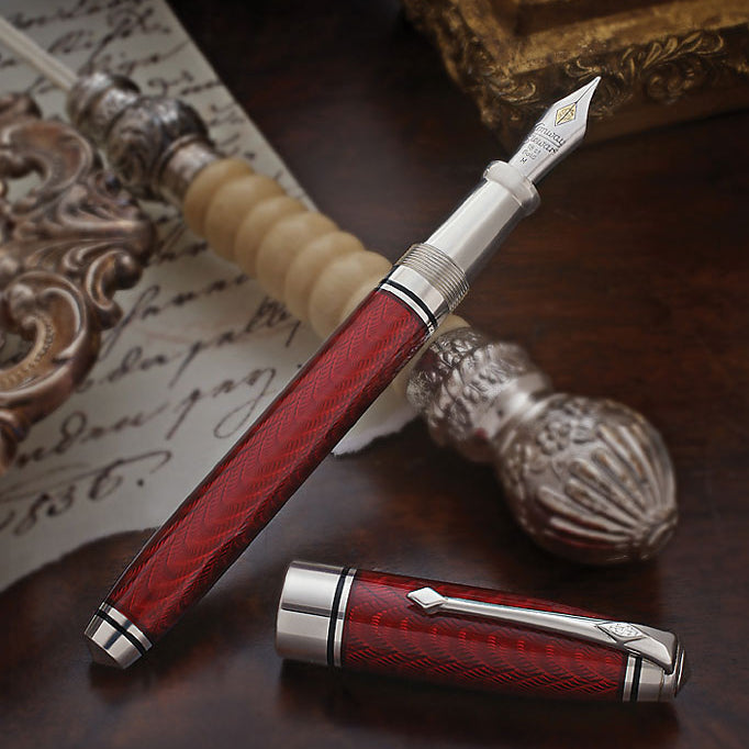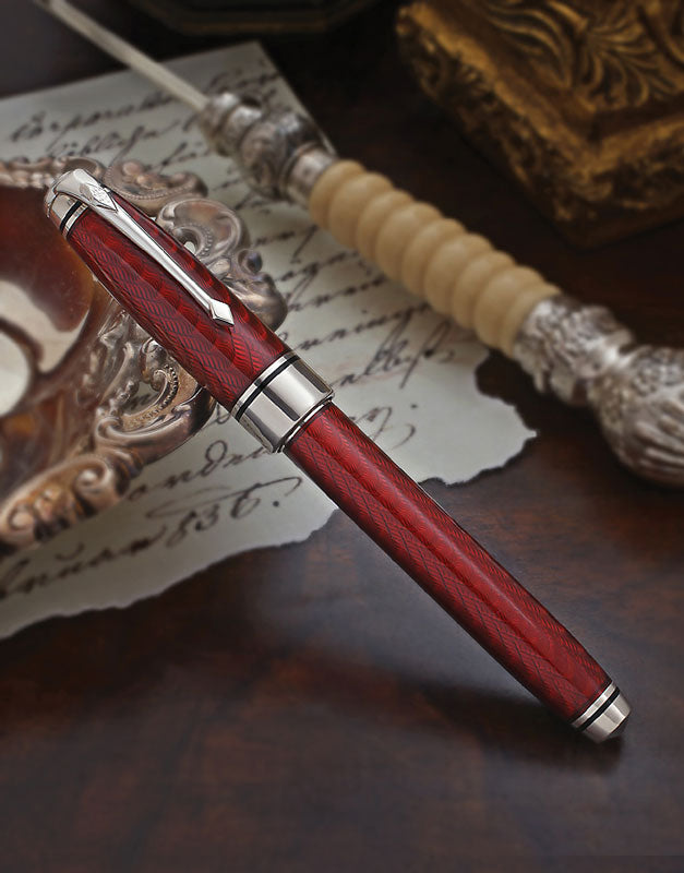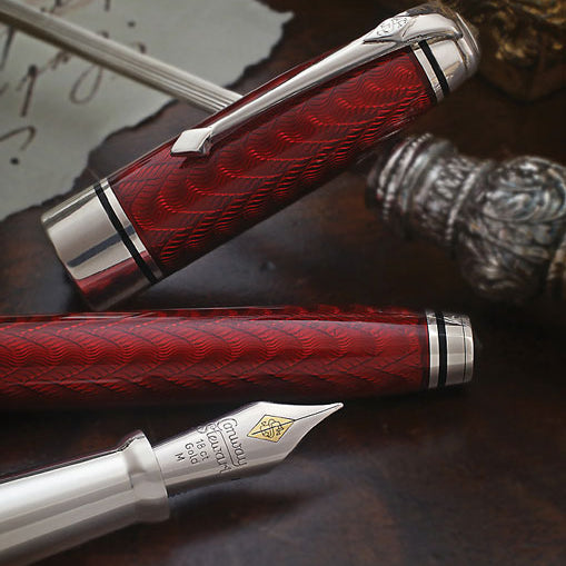 La edición Conway Stewart Cromwell está cuidadosamente elaborada en plata de ley maciza, siguiendo la forma y el tamaño de nuestra popular serie Elegance. El capuchón y el cuerpo han sido adornados con un nítido grabado guilloché en un elegante patrón de brocado en cascada, luego cubiertos con un rico y reluciente esmalte carmesí.