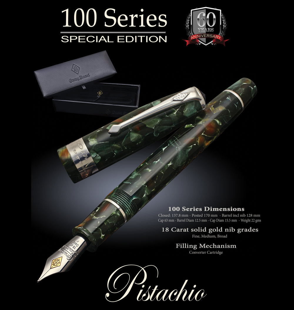 La série 100 a été lancée pour la première fois en 1954 et est rapidement devenue l'un des stylos surdimensionnés les plus populaires jamais fabriqués par Conway Stewart. Pour célébrer ce modèle populaire et emblématique créé il y a 60 ans, Conway Stewart est heureux de lancer une édition spéciale de la série 100 fabriquée à partir de résine artisanale Pistache — l'édition spéciale 100 du 60e anniversaire. Il s'agit du premier de la NOUVELLE gamme de stylos de la série 100. Nous lancerons très prochainement une gamme de couleurs de base dans la gamme Série 100, mais il n'y a que 60 exemplaires de cette édition spéciale. Tous les 60 sont fabriqués, donc tous attendent dans notre usine d'être expédiés, et nous espérons que tout sera parti d'ici quelques jours ! Alors dépêchez-vous et commandez dès maintenant pour ne pas rater cette opportunité de posséder une partie de l'histoire.