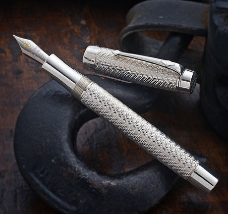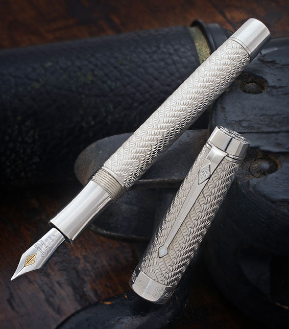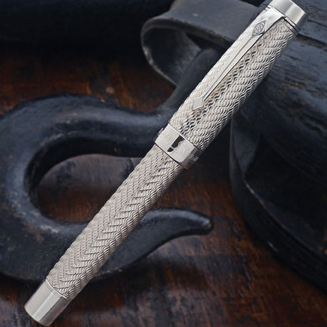 Le stylo plume Drake est fabriqué à partir d'une tige solide en argent sterling. La gravure guillochée est utilisée pour créer un motif de vague fluide sur le capuchon et le corps, mis en valeur par un haut de capuchon, une bande de capuchon et une extrémité de corps hautement polis.