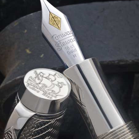 La section en argent sterling massif laisse le poids centré bas dans la main, garantissant que le stylo est bien équilibré lors de l'écriture. Chaque stylo est gravé du nom de Drake sur la bande du capuchon et d'une ressemblance avec The Golden Hind sur le dessus du capuchon. Le Conway Stewart Drake porte le poinçon anglais Sterling Silver, la norme mondialement acceptée pour les métaux précieux.
