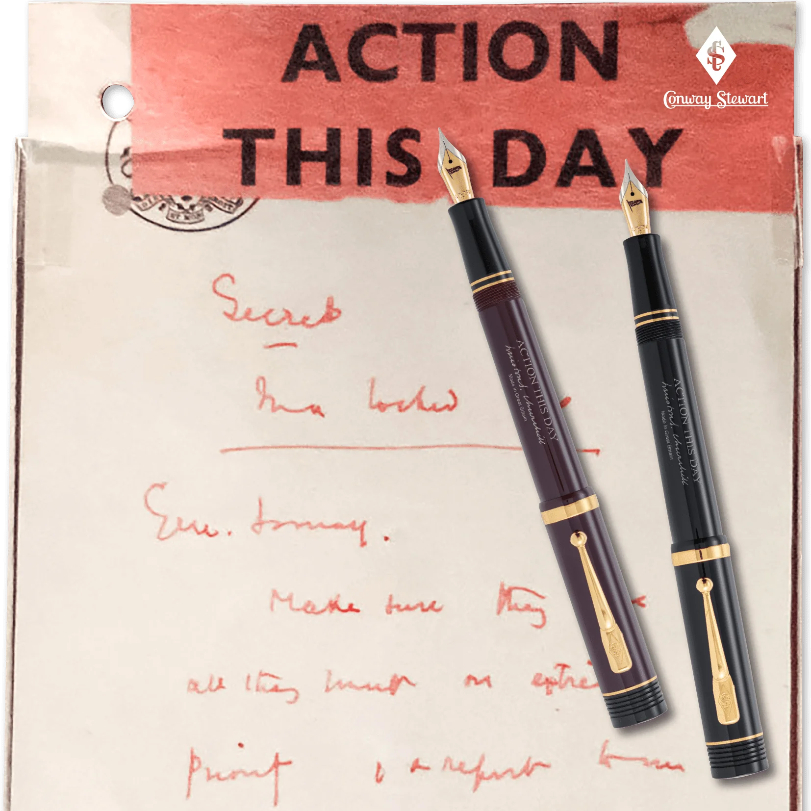 Présentation du stylo Conway Stewart Churchill Heritage « Action This Day », le troisième d'une série de stylos produits en association avec Churchill Heritage, visant à maintenir en vie l'héritage de Sir Winston Churchill. Ce stylo en édition limitée est disponible en deux couleurs et est gravé du croquis emblématique de "Pug", que Churchill a dessiné pour sa femme. Les mots "ACTION THIS DAY" sont gravés sur le corps et le stylo est accompagné d'un livre intitulé "Good Advice from Winston Churchill". Chaque stylo est livré dans une réplique de l'une des boîtes d'armoires rouges de Churchill et est disponible sous forme de roller ou de stylo plume, avec jusqu'à 20 % du prix de vente reversé à Churchill Heritage. Seuls 100 stylos de chaque citation de la série seront fabriqués, alors ne manquez pas votre chance de posséder un morceau d'histoire.