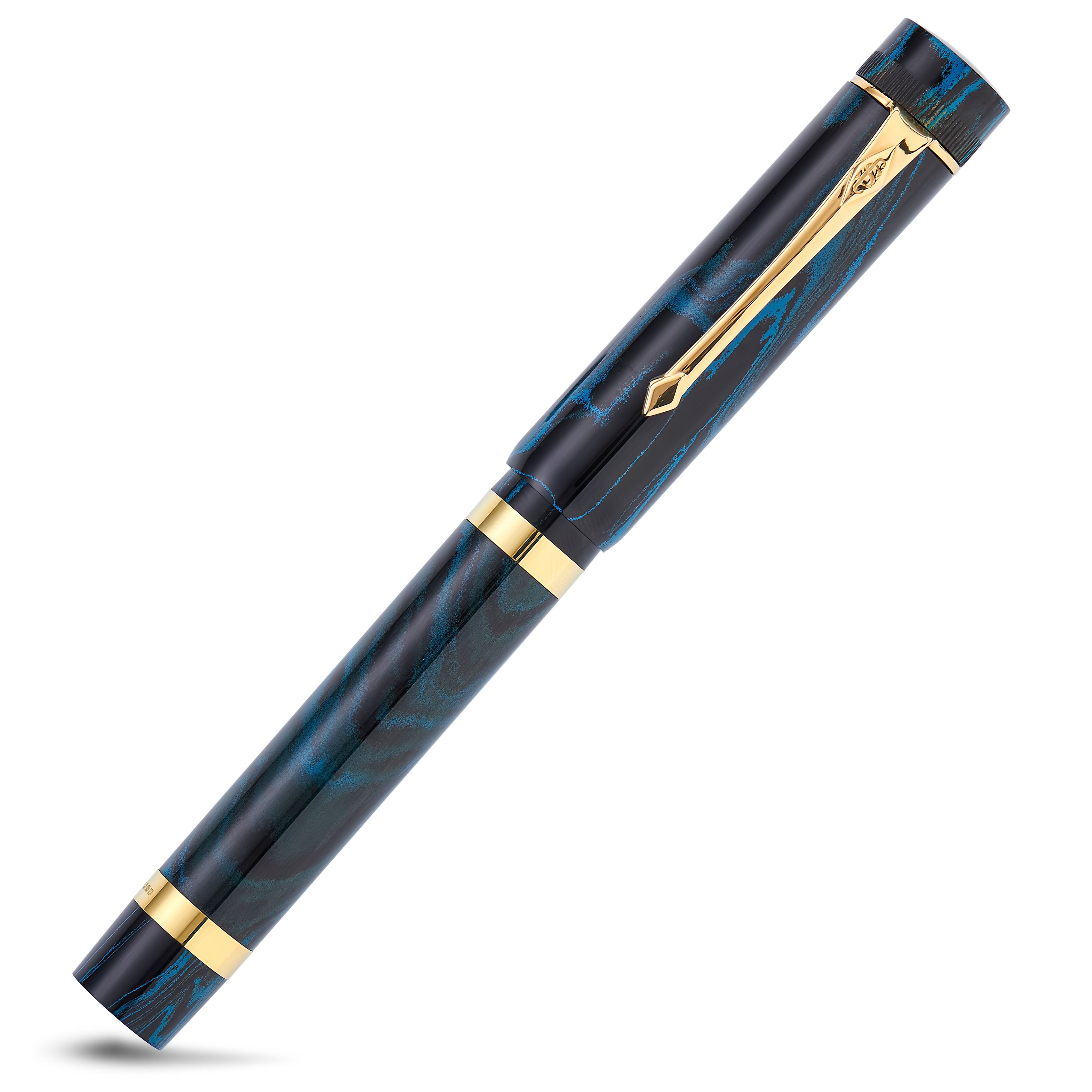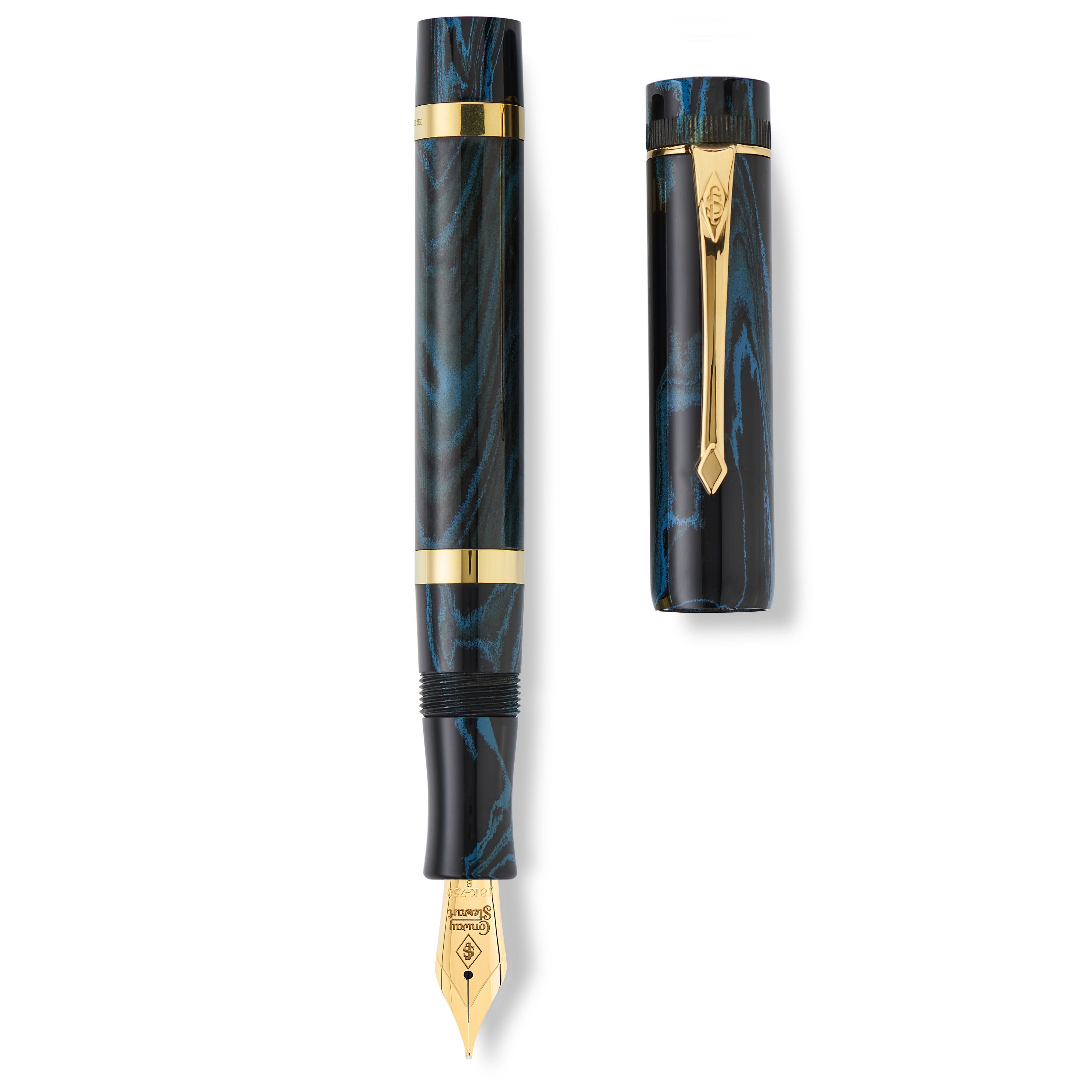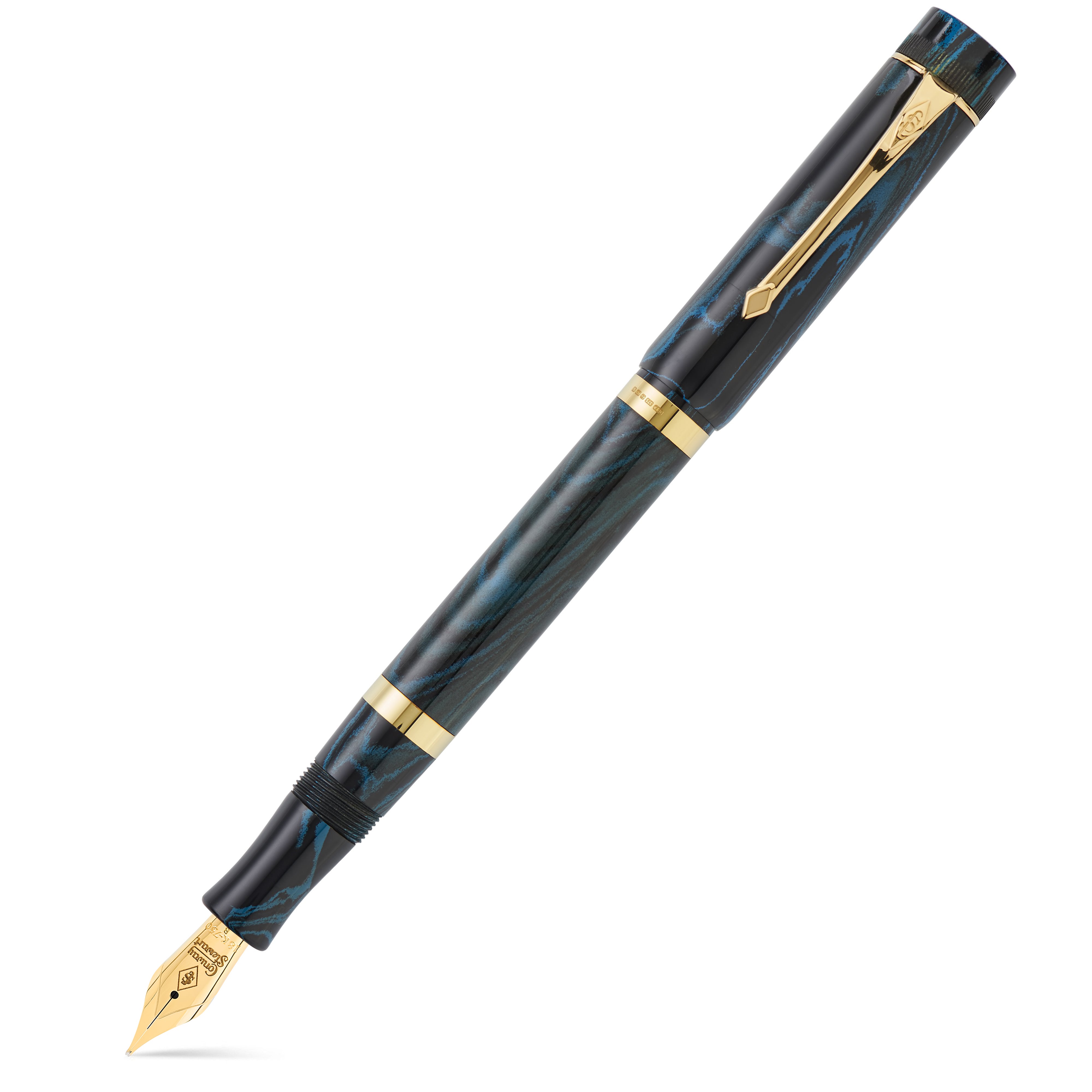 Le Conway Stewart Marlborough Vintage Blue Ripple est un superbe stylo plume qui incarne le style classique des modèles Conway Stewart vintage des années 1920. Fabriqué à partir d'ébonite de haute qualité, ce stylo est l'un des rares stylos en ébonite restants disponibles. Le design rectiligne du capuchon et du corps ainsi que le clip rondelle de style vintage lui confèrent un look intemporel. Le stylo présente un motif dentelé autour du haut du capuchon et deux larges bandes en or massif 9 carats autour du corps, rappelant l'époque Art Déco. Le Marlborough Vintage Blue Ripple est soigneusement assemblé, poli et ajusté par des experts pour garantir sa haute qualité.