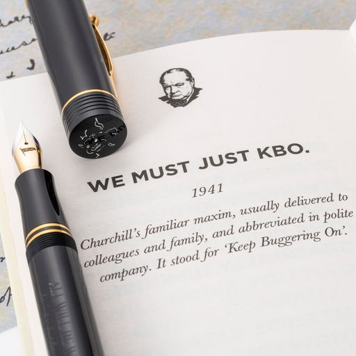 Le stylo Conway Stewart Churchill Heritage 'KBO' est le quatrième de la série de stylos en édition limitée produits en association avec Churchill Heritage. Inspiré de la célèbre maxime de Churchill "Keep Buggering On", le stylo KBO est disponible en noir classique ou bordeaux, avec des garnitures en or 9 carats ou en argent sterling. Chaque stylo est gravé du croquis et de la signature emblématiques "Pug" de Churchill, ainsi que des mots "KBO" et "Made in Great Britain". Le stylo est livré dans une réplique de la Red Cabinet Box de Churchill, avec un livre de 120 de ses citations célèbres et un fac-similé de sa lettre de 1909 à sa femme. Limité à 100 stylos dans le monde, jusqu'à 20 % de chaque stylo vendu va à Churchill Heritage pour soutenir les événements et l'éducation qui préservent l'héritage de Churchill. Le stylo KBO est disponible sous forme de roller ou de stylo plume avec une plume en or 18 carats avec l'Union Jack gravé au laser sur le devant.