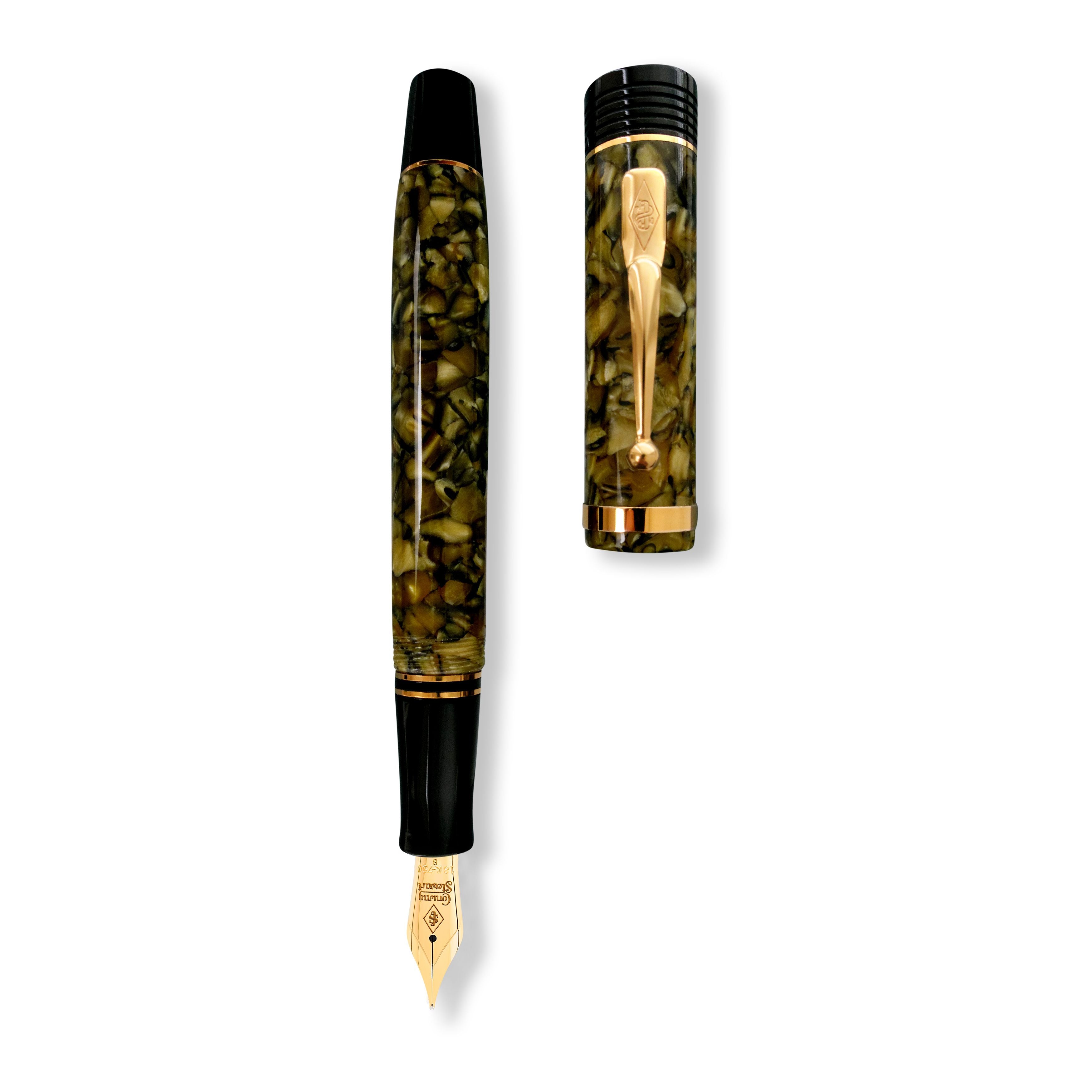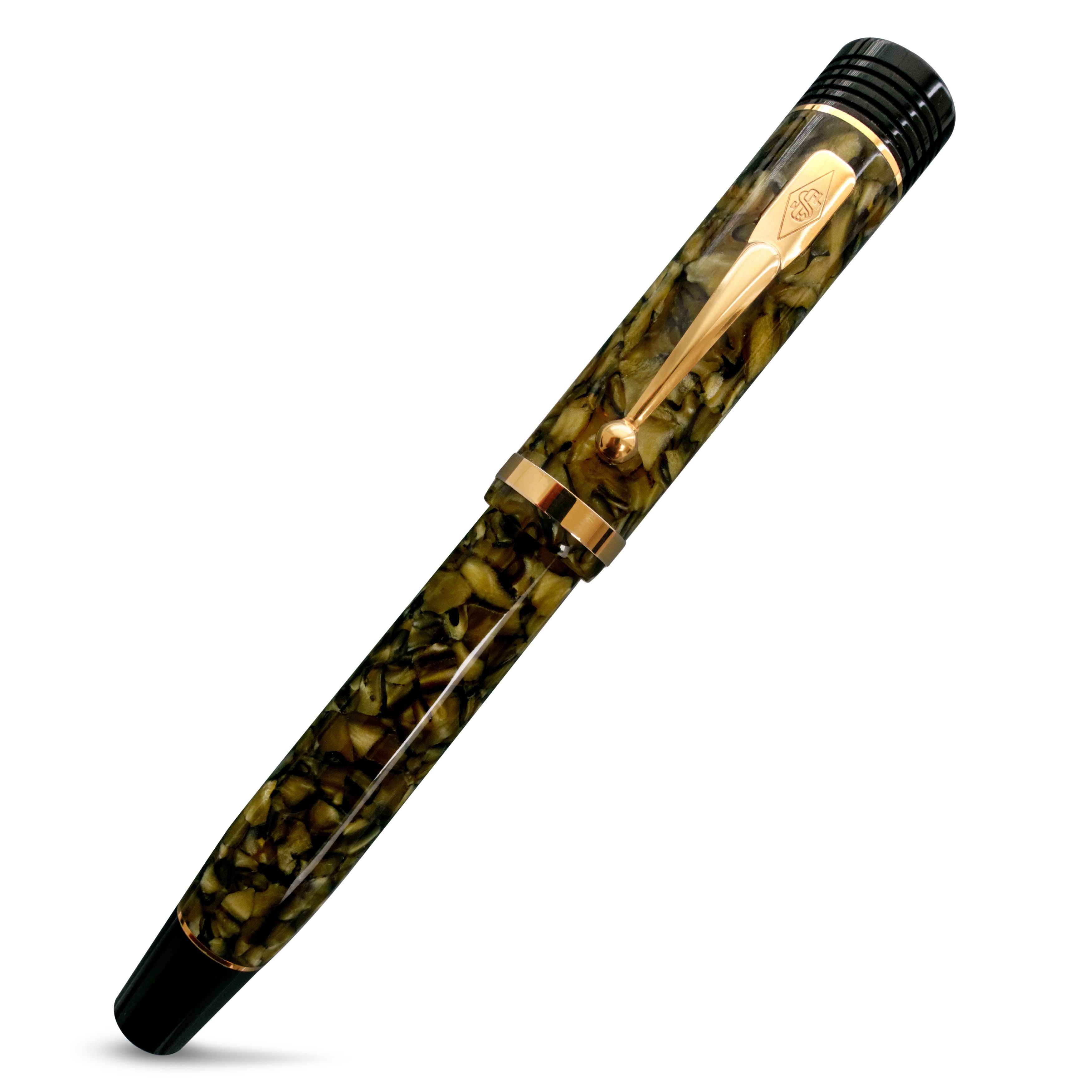 Le Conway Stewart Churchill Quartz Green est un superbe stylo qui présente un beau mélange de taches vertes, brunes et noires. Avec ses teintes plus claires et plus foncées et ses somptueuses garnitures dorées, ce stylo attirera à coup sûr l'attention de nombreux admirateurs. L'anneau du capuchon en or 9 carats est estampillé des poinçons anglais, un témoignage de sa qualité et de son héritage. Disponible en stylo plume, stylo à bille, roller ou crayon, le Conway Stewart Churchill Quartz Green est un incontournable pour ceux qui apprécient l'artisanat raffiné et le design exceptionnel. Que vous soyez un collectionneur ou un utilisateur quotidien, ce stylo impressionnera à coup sûr.