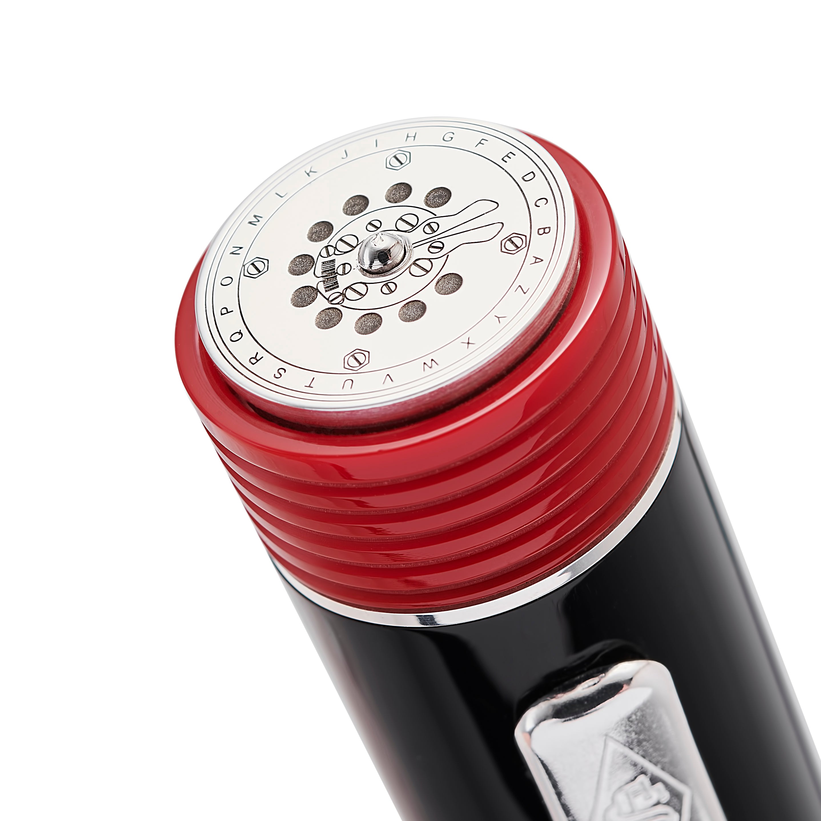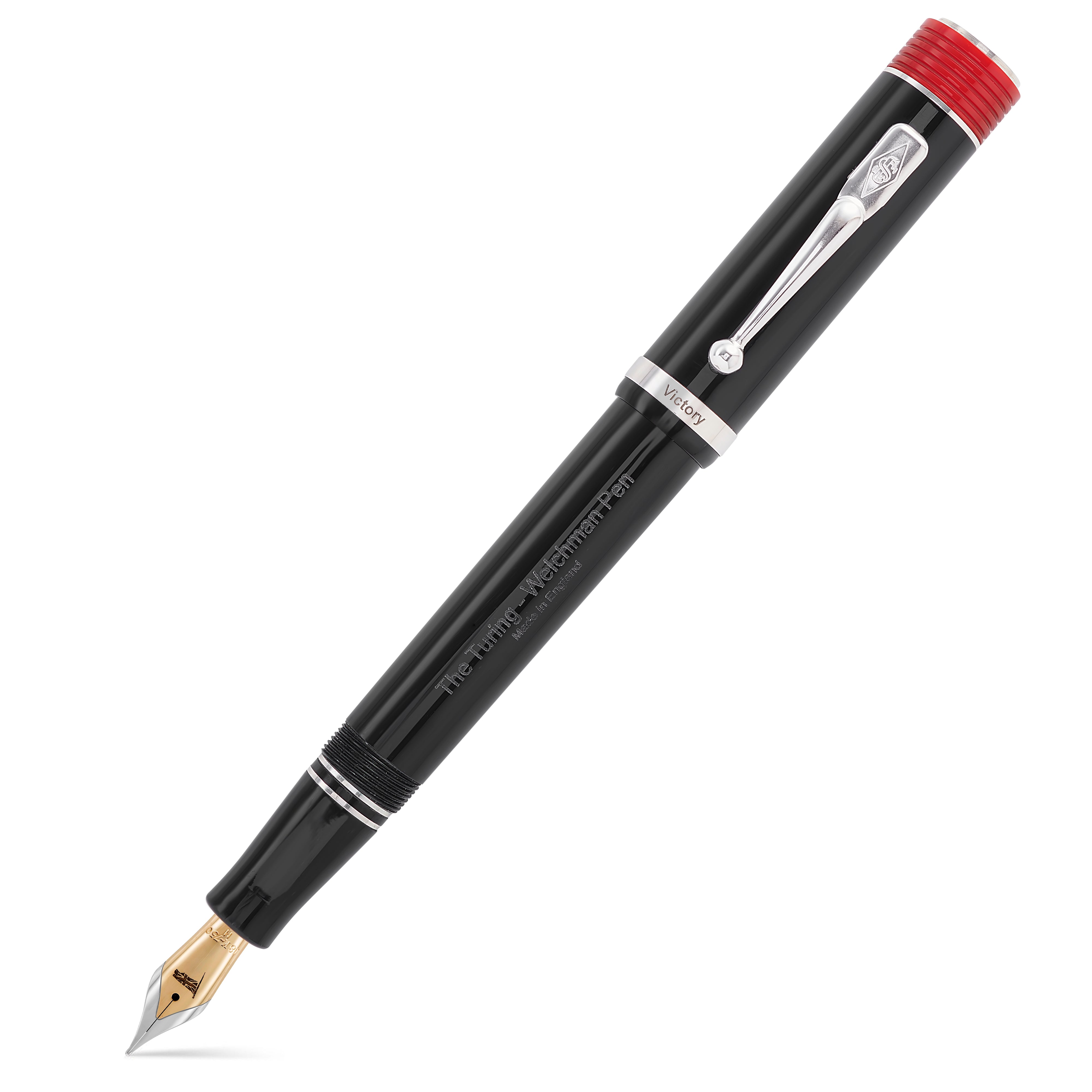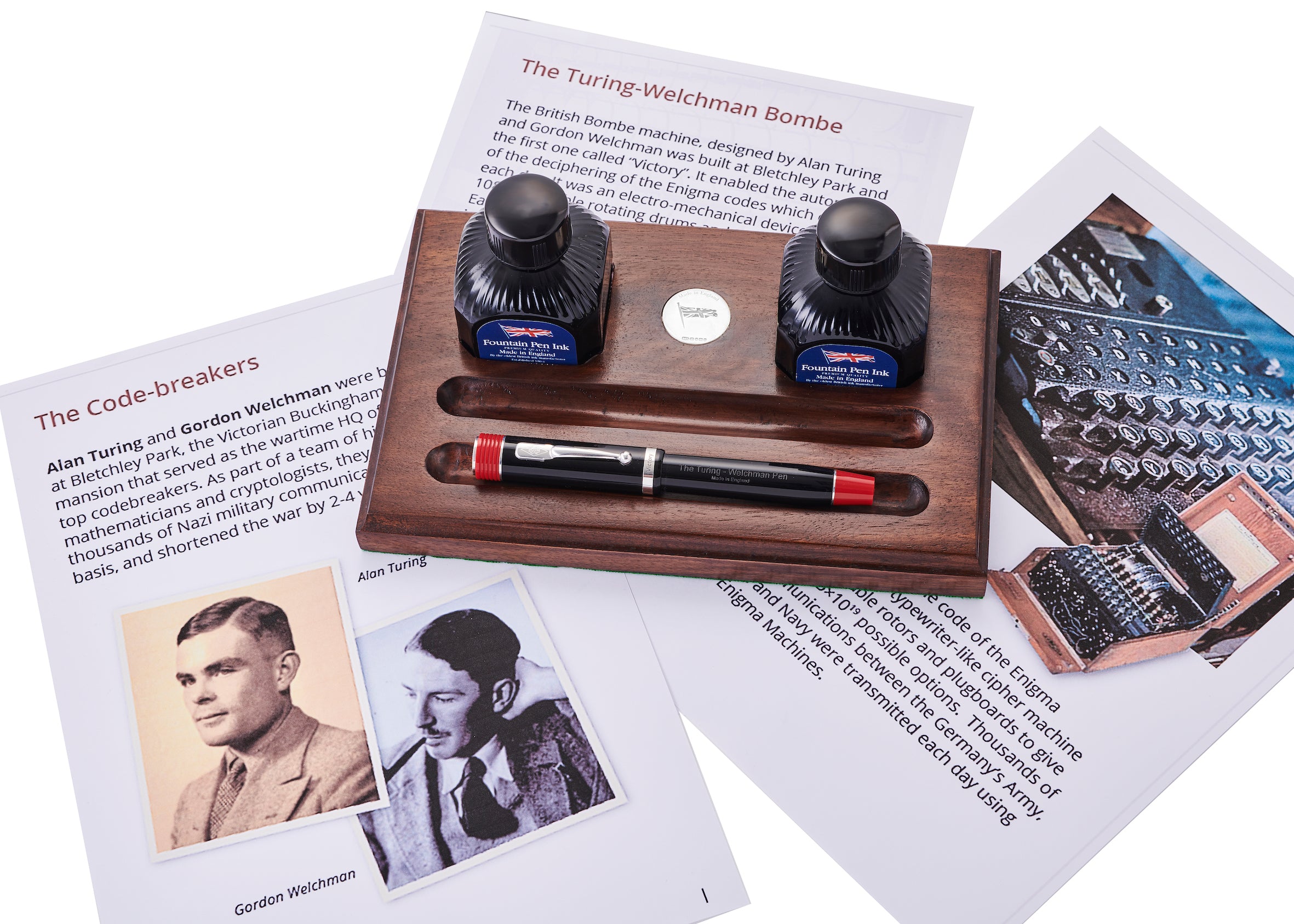 第二次世界大戦中にエニグマで暗号化されたメッセージを解読するために使用されたチューリング・ウェルチマン・ボンベ・マシンを作成したアラン・チューリングとゴードン・ウェルチマンの功績を記念してデザインされた211本の限定版、チューリング・ウェルチマン・ペンの紹介です。各ペンには番号が付けられており、実際のボンベドラムと同じように、表面にアルファベット 26 文字がエッチングされたスターリングシルバーのトップが特徴です。幅広のスターリングシルバーのキャップ バンドには「Victory」の文字が表示され、英国のホールマークがその品質を証明しています。バレルには、これら最も独創的な人々の記憶を生き続けるために「チューリング・ウェルチマン・ペン」という言葉が刻まれています。小さな巻物を収納できる秘密のコンパートメントもあり、隠しメッセージに最適です。万年筆またはローラーボールとして販売されており、販売された各ペンの一部は、現役の歴史的コンピューターの世界最大のコレクションがあるブレッチリー パークの国立コンピューティング博物館に寄付されます。