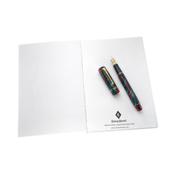 同じエレガントなグリーン、ブラック、バーガンディの色合いで、コンウェイ・スチュワートのロゴと「Made in England」のゴールド文字がフロントフラップの下に隠されています。